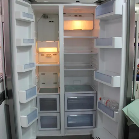 This holiday home offers a kitchen featuring a refrigerator, an oven, and kitchenware. - ❓